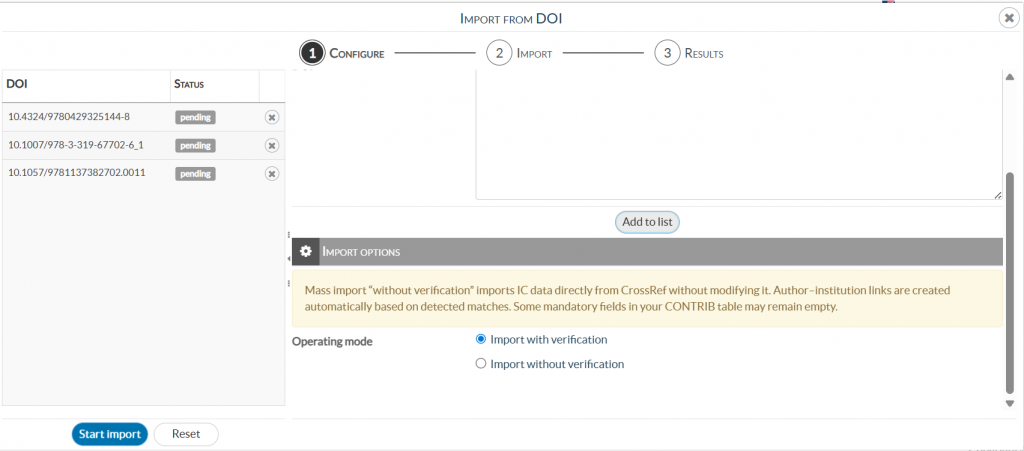 With import without verification, each DOI in the list is automatically processed and validated by the system. The contribution is then imported without any action required on your part.