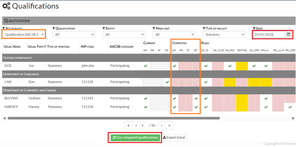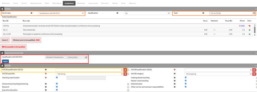 - Select the group of qualification rules to apply for the calculation, for example: AACSB 2020