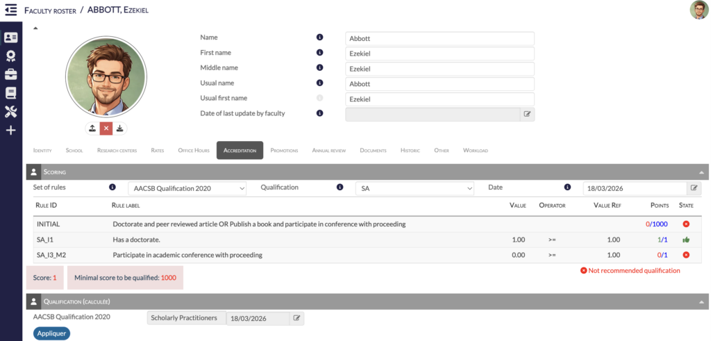 The tool computes your faculty’s qualification (SA, PA, SP, IP) based on your institution’s rules, while taking into account the specific requirements of each major accreditation.