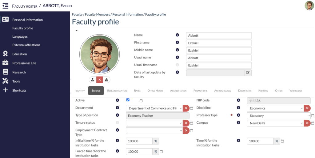 This screen allows you to access data related to your faculty’s relationship with your institution, including their department, title, type or campus, as well as information required for accreditation purposes, such as time allocated to institutional tasks.