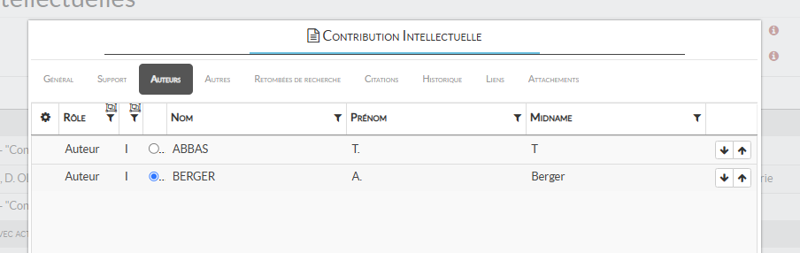 Depuis le menu Recherche > choisir Contributions intellectuelles : pour consulter/modifier les contributions existantes, ou en ajouter.