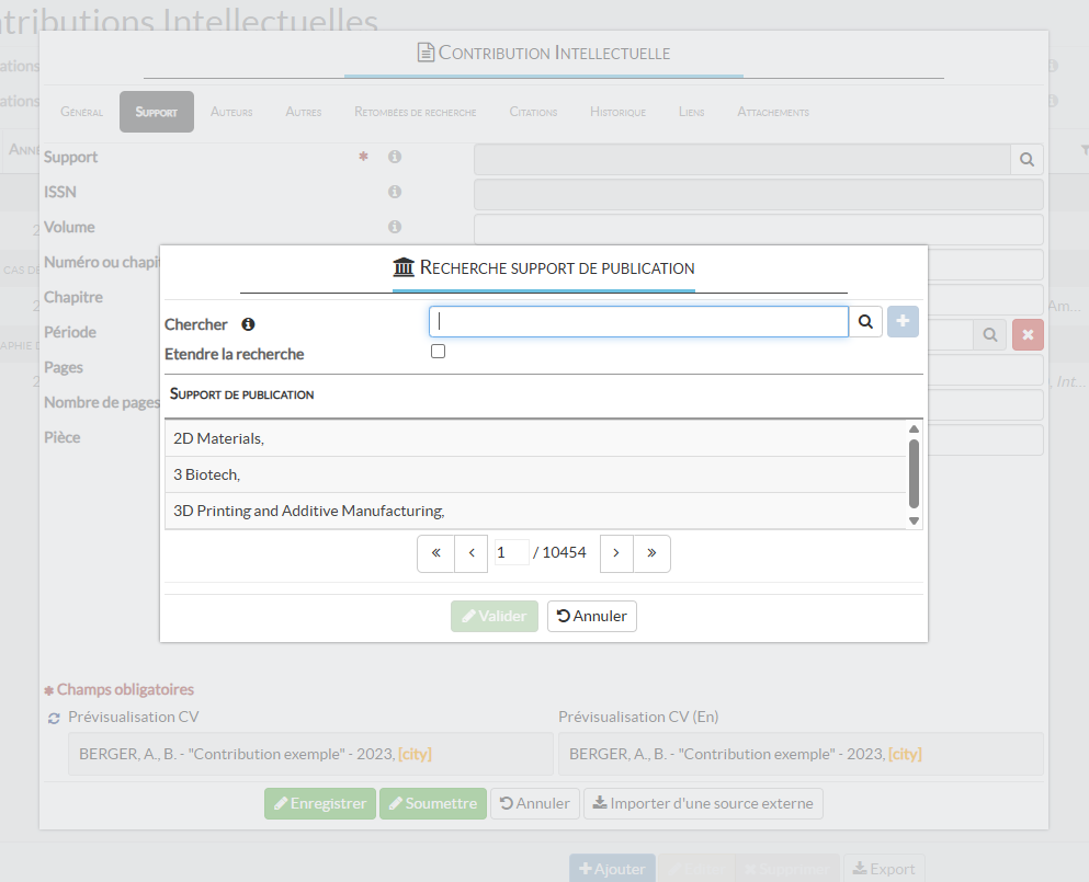 Pour certains types de contributions intellectuelles (articles, chapitres de livres, direction d’ouvrage …), un onglet Support apparaît dans la fenêtre d’édition de la contribution : le nom d’un support de publication doit obligatoirement être associé à la contribution pour l’enregistrer.