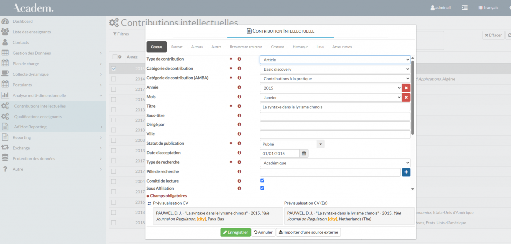 Les analyses des contributions intellectuelles et des qualifications des enseignants permettent un filtrage précis de ces données, et donnent un accès direct vers leur modification.