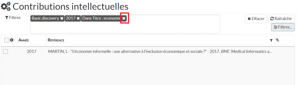 Les filtres sélectionnés apparaissent dans l’encadré en haut de la liste des résultats. Cliquer sur la croix située à droite du filtre pour le supprimer de la liste (voir image ci-dessus).