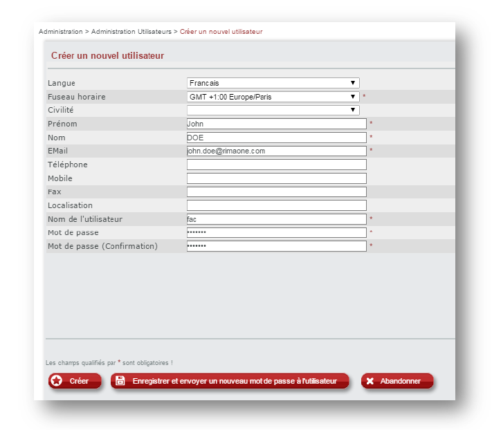 Renseigner les informations liées à ce nouvel utilisateur : renseigner au minimum les champs obligatoires avec une astérisque rouge *.