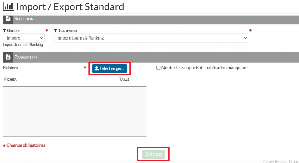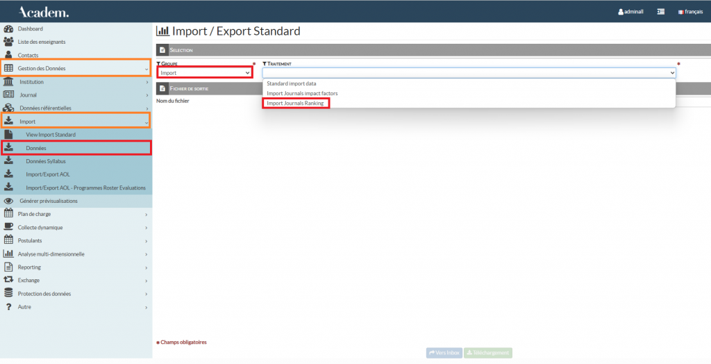 1/ Depuis le menu Gestion des données > Import > Données : sous le libellé Groupe, sélectionner : Import, puis sous le libellé Traitement, sélectionner : Import Journals Ranking.