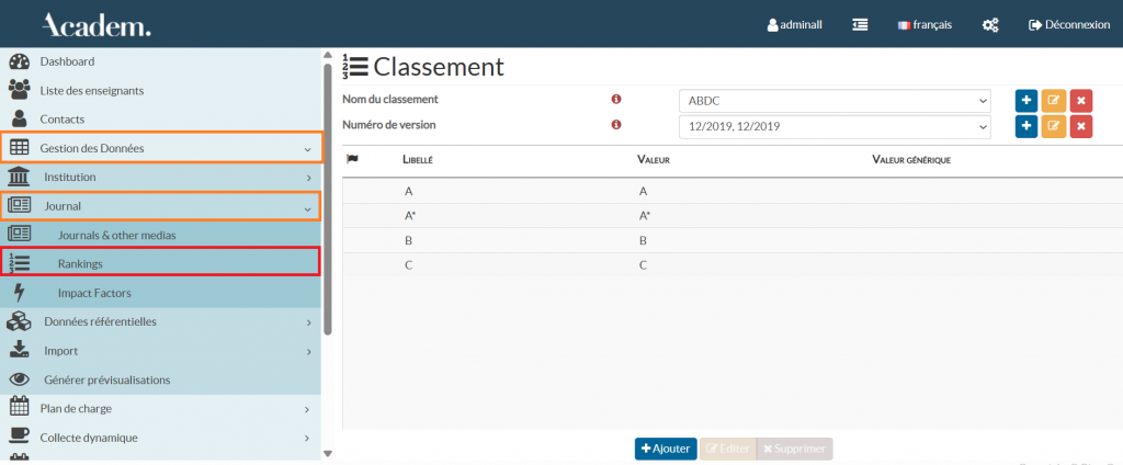 L’import des classements de revues scientifiques dans ACADEM, permet d’évaluer et valoriser la qualité des publications des enseignants chercheurs au sein de l’institution.