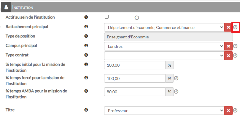 Les champs historisés sont identifiables grâce à l’icône horloge, présente à la droite du champ. Cliquer sur l’icône horloge pour consulter l’historique de changement.