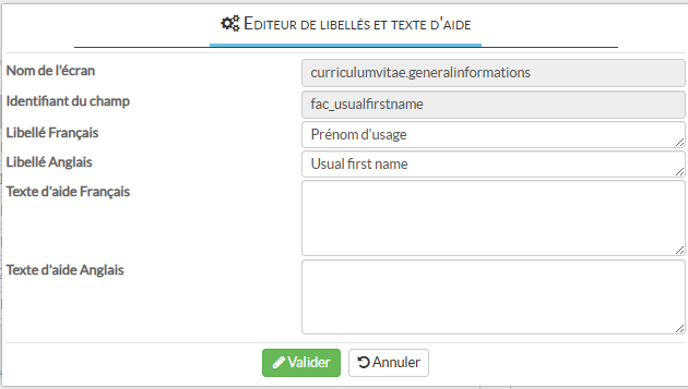Pour modifier l’affichage d’un champ, onglet ou bouton à l’écran : positionner la souris sur l’élément à modifier et cliquer droit > un encadré s’affiche sous le champ : Editer les libellés et aides des champs > cliquer sur l’encadré pour accéder à la fenêtre d’édition.