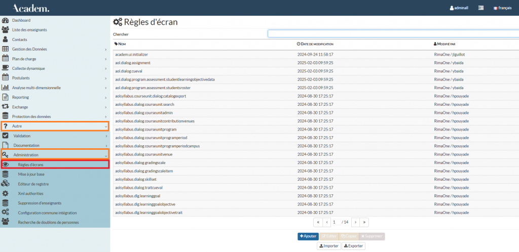 ℹ️ Pour modifier les règles d’écran, il est conseillé d’ouvrir ACADEM dans deux onglets, pour jongler plus facilement entre les écrans et copier/coller les informations utiles d’un écran à l’autre.