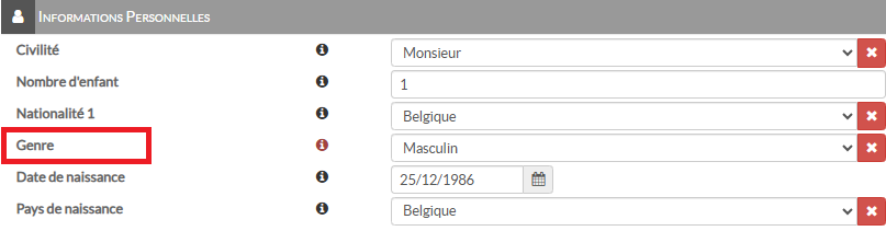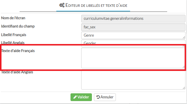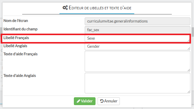 Dans cet exemple, le libellé du champ fac_sex « sexe » est modifié par « genre ».