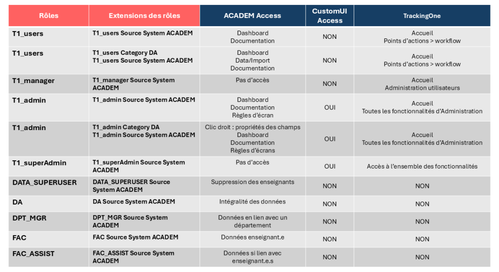 Les rôles définissent les accès et les actions autorisés pour chaque utilisateur ACADEM.
