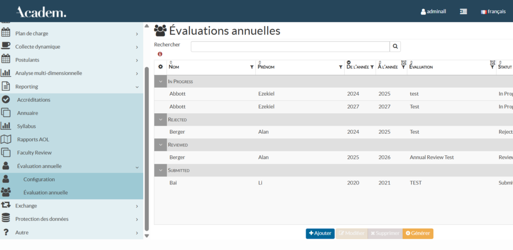 Cette fonctionnalité vous permet de déployer un processus d’évaluation annuelle auprès des enseignants-chercheurs de votre institution.