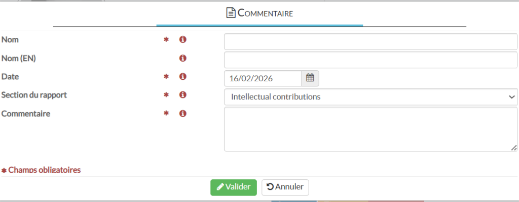- Commentaires : possibilité d’ajouter des précisions ou des compléments pour valoriser les travaux dans certaines sections du rapport.