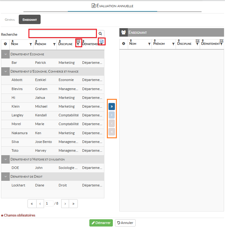 Vous pouvez également choisir de lancer l’évaluation auprès de l’ensemble des enseignants de votre base de données, en utilisant la double flèche bleue.