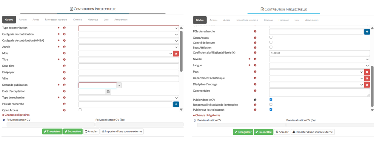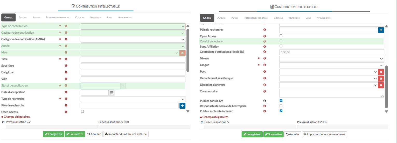 Identifier quels champs doivent obligatoirement être renseignés, lors de l’ajout d’une Contribution Intellectuelle dans ACADEM, pour remplir vos rapports AACSB ?