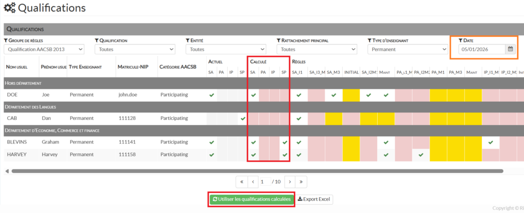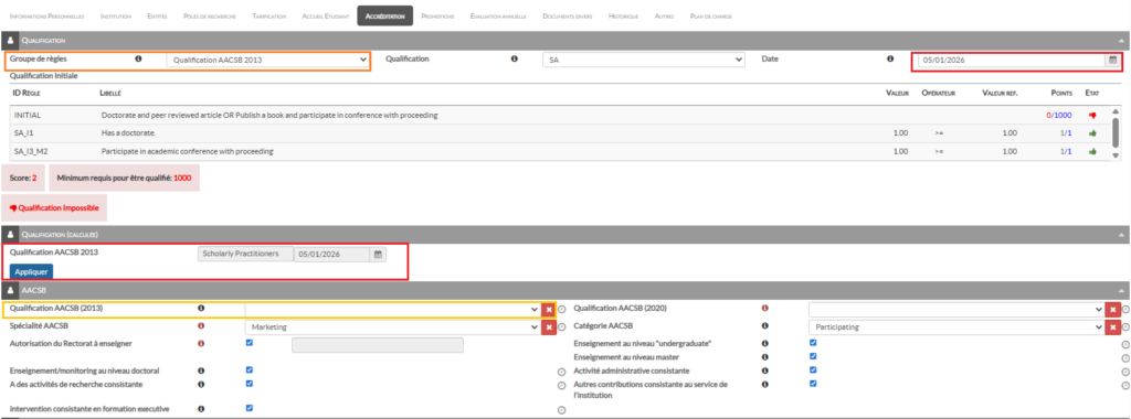 - Sélectionner le groupe de règles de qualification à appliquer pour le calcul > ex : AACSB 2020
