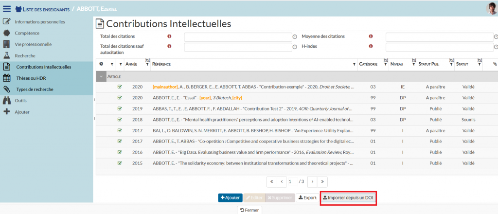 La liste des contributions de l’enseignant-chercheur s’affiche.