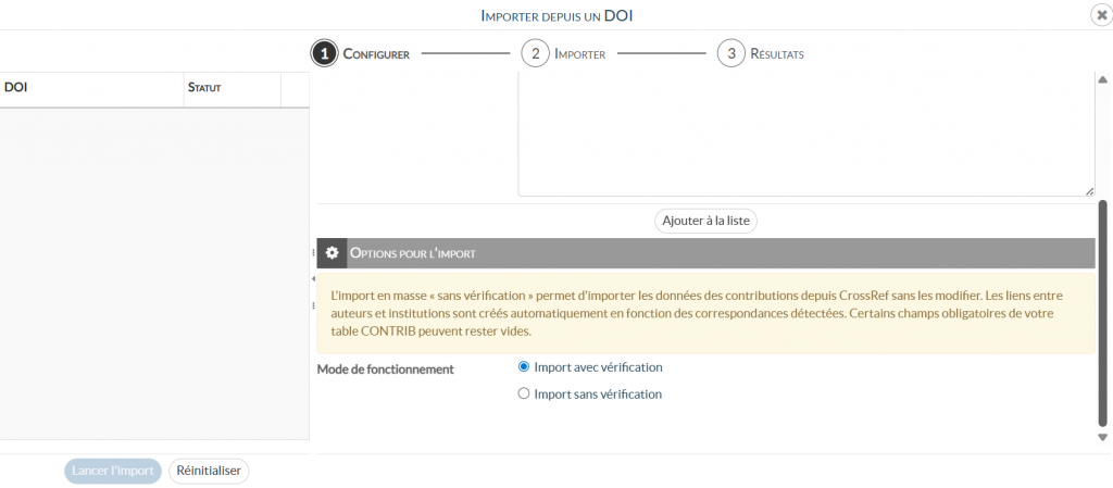 • En cliquant sur « Ignorer », vous annulez l’import de cette contribution et passez directement au DOI suivant.