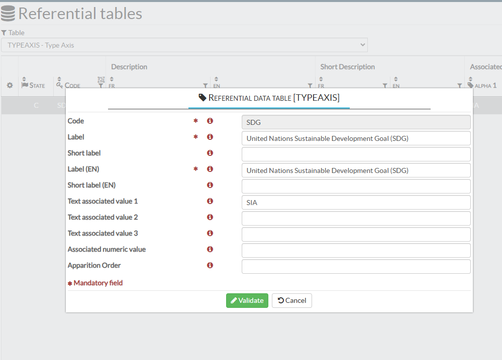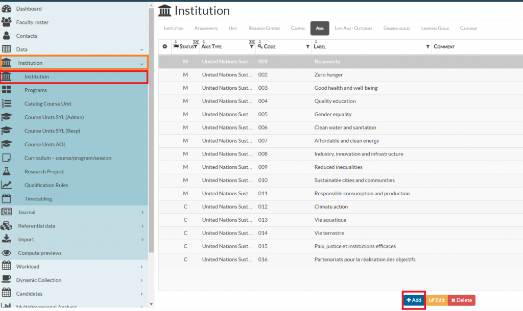 • AX_uniquecode: enter a unique code for the institutional axis (for example SDG01, SDG02 …)