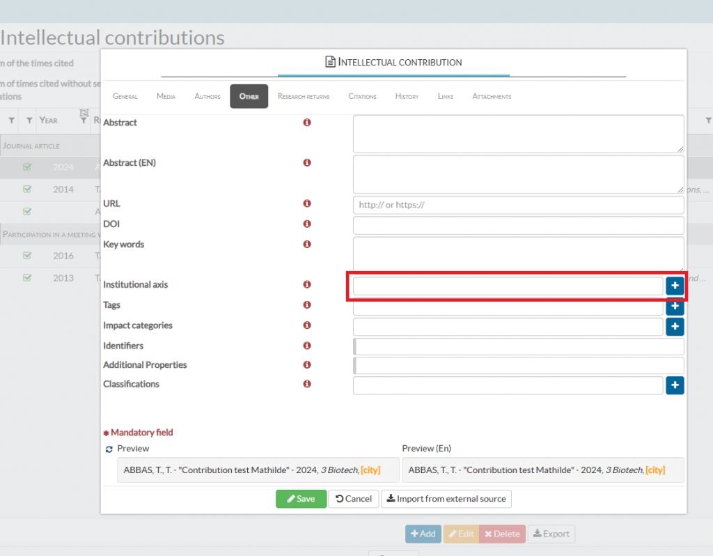 An institutional axis can be added to an Intellectual Contribution once it has been registered in ACADEM.