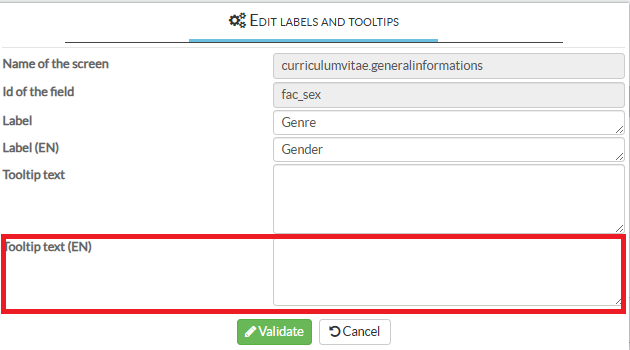 2/ Enter the tooltip text in the language in which you are using the tool (in this case in english) and confirm.
