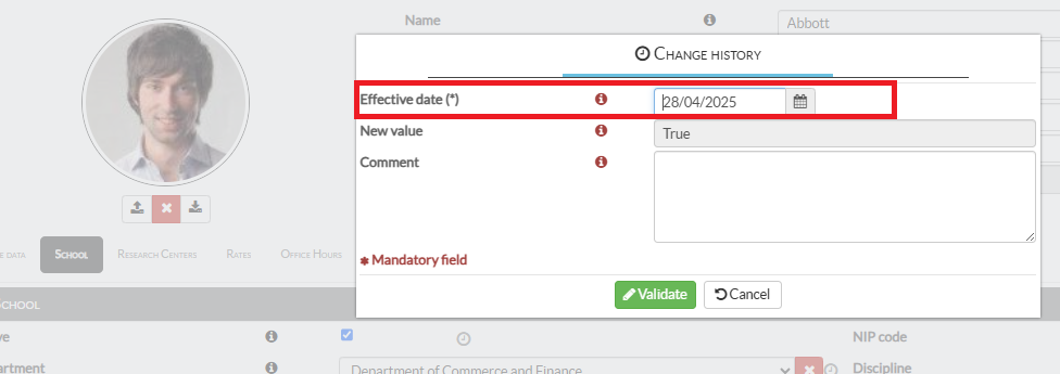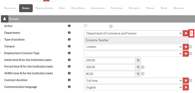 ℹ️All changes to historised values can be followed from the Historic tab on faculty member’s profiles: Faculty roster > Personal information > Historic