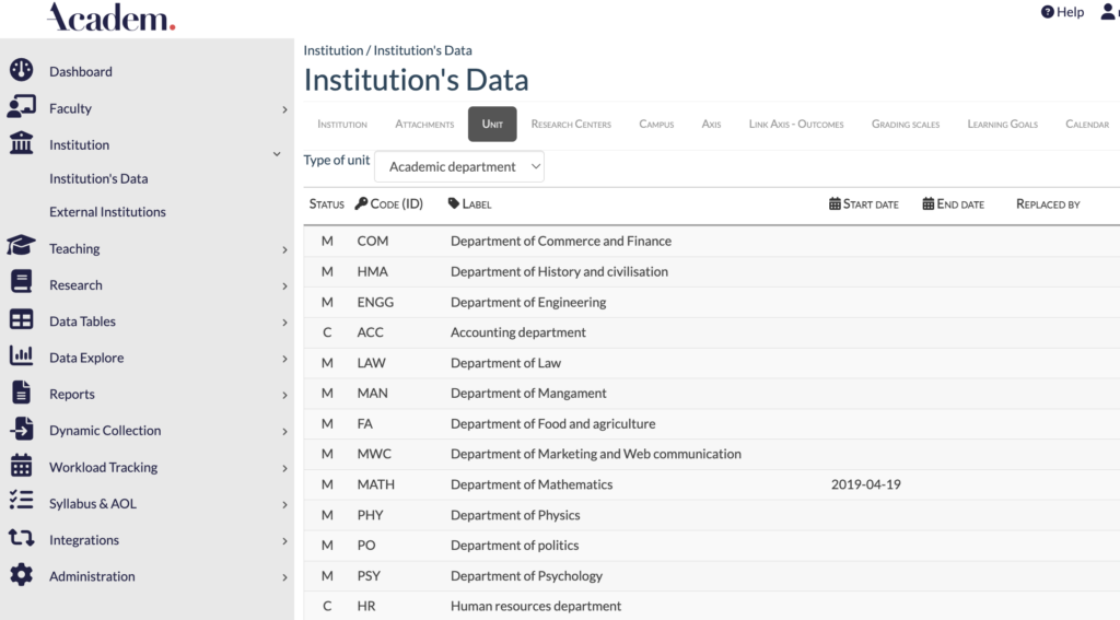 This menu allows you to centralize your institution’s data, such as the different academic units or campuses that make up your school.