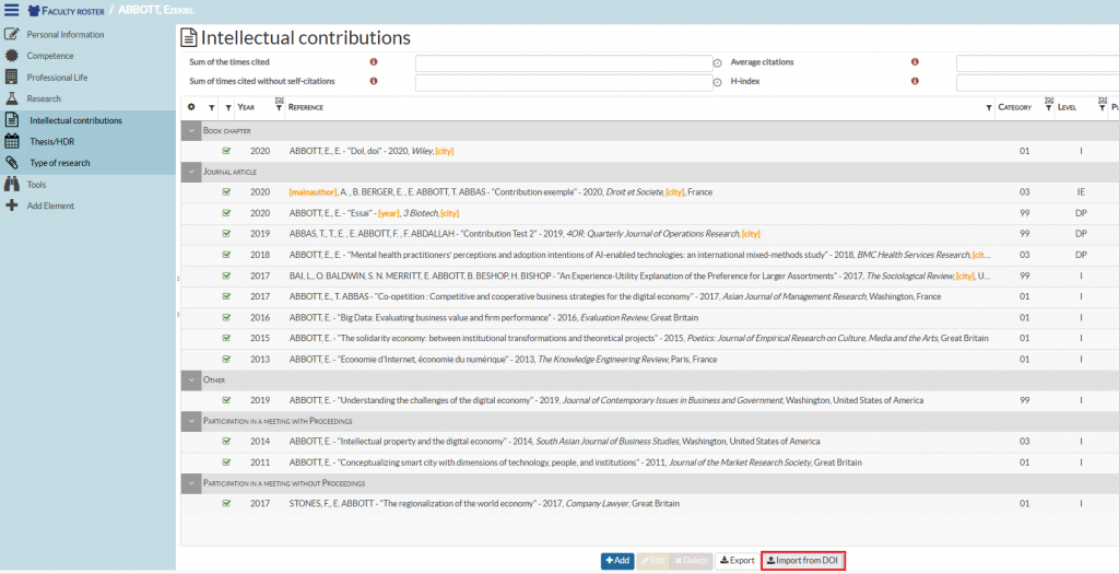 Importing via DOI allows you to quickly add one or more contributions to the profile of the same author within your institution.
