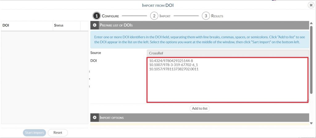 1. Enter the DOI identifier(s) of the contributions to be imported into the database.